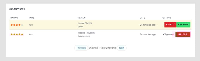As you can see in the example above, you can approve and reject reviews, and filter any you do not wish to be displayed on your products.