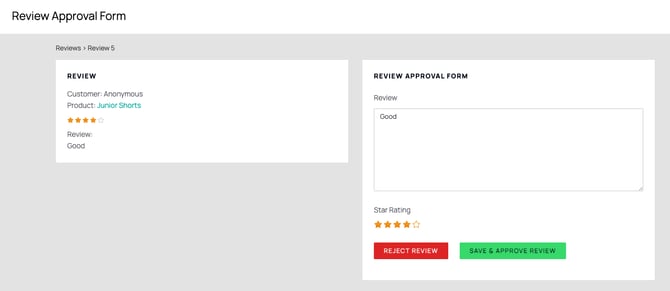 Clicking Save & Approve Review will save the review and display it on the product product page of the product. Rejecting means it will be deleted.