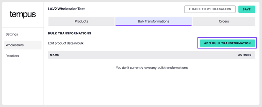 Go to Tempus > Wholesalers > [Your Wholesaler] > Bulk Transformations. Add a new transformation and follow these steps: